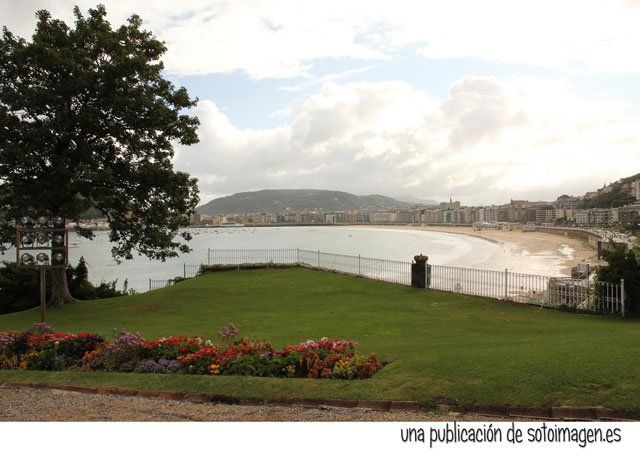 Por un arco de piedra accedimos a Miramar Parkea, cruzamos unos cuidados jardines y llegamos junto a un palacete en lo alto de una colina. Desde aquella posición privilegiada oteamos la playa de la Concha a la diestra y la de Ondarreta a la siniestra. Una delimitada por el Monte Urgull y la otra por el Monte Igueldo, en medio de la ensenada La isla de Santa Clara.