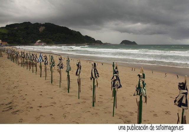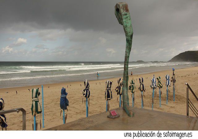Volvimos a recorrer casi todo el paseo marítimo. A poco de llegar al final cayó una tromba de agua que nos obligó a refugiarnos en unos soportales. A excepción de los intrépidos surfistas todo el mundo buscó refugio en aquel lugar. En el horizonte se mezclaban nubarrones y mar, todo gris. Vimos pasar al socorrista cabizbajo con las banderas a modo de lanza desafiando el impresionante aguacero.