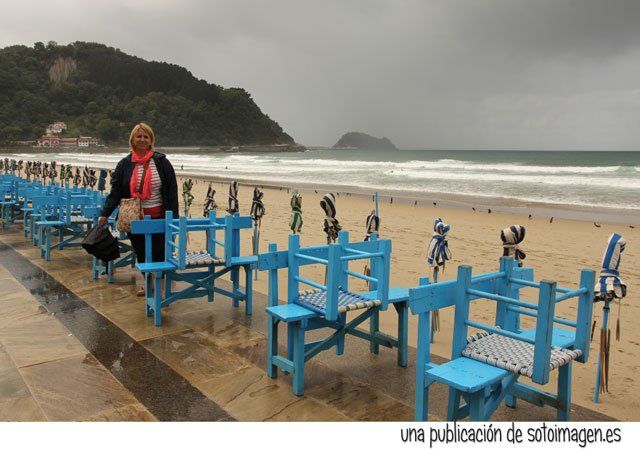 El cielo descargó más de una vez durante el trayecto. Es más… fue apearnos del bus y volvieron a caer unos orondos goterones. Llegamos al paseo marítimo y fuimos testigos de la bravura del Cantábrico. El agua era gris y el cielo lo era aún más. La nota de color la ponían unas mesas y sillas de madera, azules y verdes.