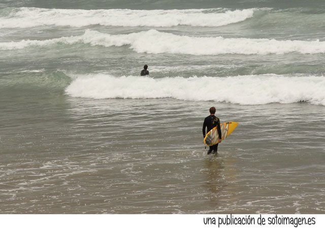 En el mar… pues intrépidos surfistas cabalgando olas y en la arena otros menos atrevidos disfrutando del espectáculo gratuito, esperando que amainase.