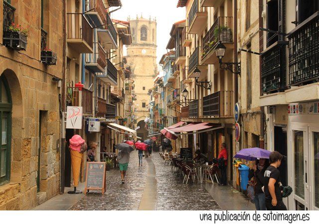 Desde lo más alto de aquel lugar oteamos el puerto y la iglesia de San Salvador. A lo lejos, en la costa volvimos a ver Zarautz iluminado por el sol. Vuelve a llover con fuerza, tomamos una calle muy vasca que nos lleva hasta la misma iglesia.