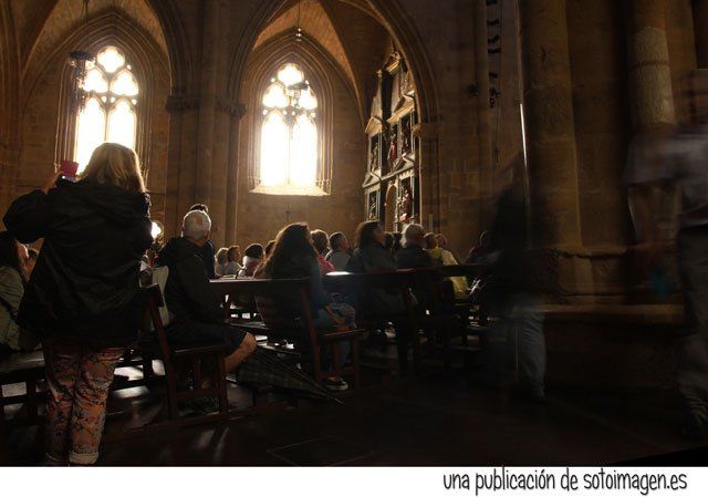 Accedemos a su interior y hay tantísima gente que pienso que hay misa. Poco a poco se me dilatan las pupilas y me doy cuenta de que son turistas sentados en los bancos esperando que escampe. Me paseo por su interior y noto que el suelo está inclinado, extraña sensación en aquella penumbra.