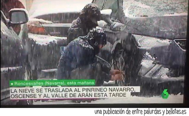 Salimos al exterior, continuaba nevando. Había llegado el momento de volver a Ochagavía. El coche circulaba sin problemas con las cadenas puestas, muy lento, pero avanzaba. Habíamos recorrido menos de un kilómetro cuando caíamos en la cuenta de que a ese ritmo no llegaríamos nunca, y se nos presentó el dilema de quitarle las cadenas o dejárselas puestas. Porque… si más adelante había que colocarlas… ¿por dónde andaría el cámara de La Sexta?