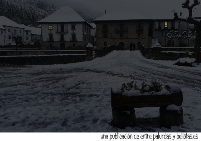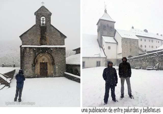 Con la panza llena ya fue otra cosa, decidimos visitar Roncesvalles. La nieve había alcanzado un grosor respetable y continuaba nevando. Se apilaba en los tejados de los edificios, de vez en cuando se precipitaba al vacío provocando un estruendo que te sobrecogía, caía en porciones cuadradas como enormes onzas de chocolate, blanco, claro. Y cuando vimos que al caer sepultaba bancos y papeleras ya no osamos caminar bajo el alero de ninguno de los tejados.