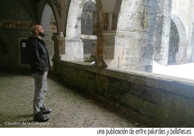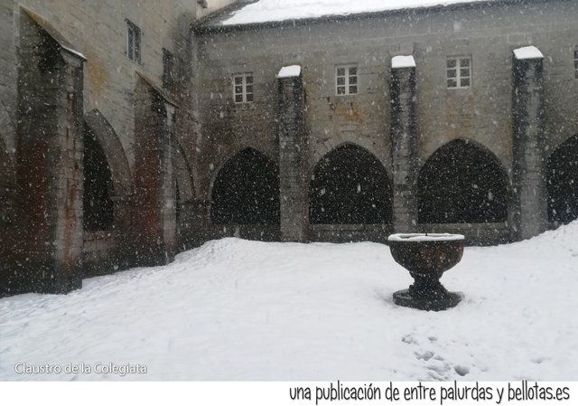 Accedimos al claustro de la colegiata, interesante lugar de incalculable valor patrimonial. En el centro se encontraba una pila bautismal que hacía las veces de fuente. En las esquinas se apilaba la nieve formando montones tan altos como nosotros mismos. Continuaba nevando.