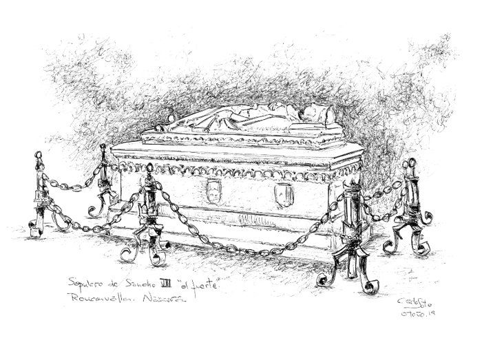 Resultó ser el sepulcro de Sancho VII el Fuerte, y lo de fuerte le venía por su altura y corpulencia. Indagando un poco supimos que era cuñado de Ricardo Corazón de León y que una dolorosa úlcera varicosa en la pierna lo mantuvo recluido en su castillo de Tudela hasta su muerte. Ya no quisimos saber nada más.