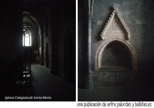 Abandonamos el recinto y accedimos a la Real Colegiata de Santa María, lugar de culto, solitario y húmedo donde sonaba un evocador canto gregoriano. Enormes pilares soportaban tres naves sumidas en la más completa oscuridad. Misticismo.