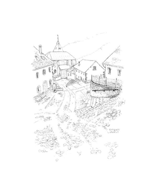 Partimos de la parte alta del pueblo, por una calle empedrada desde donde vimos abajo los tejados de la iglesia de San Juan Evangelista. Detrás, la silueta boscosa de las montañas nevadas.