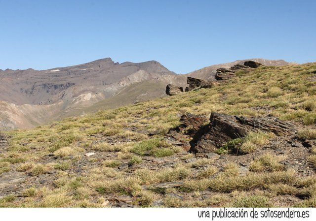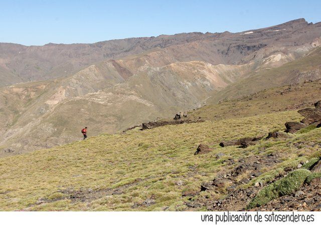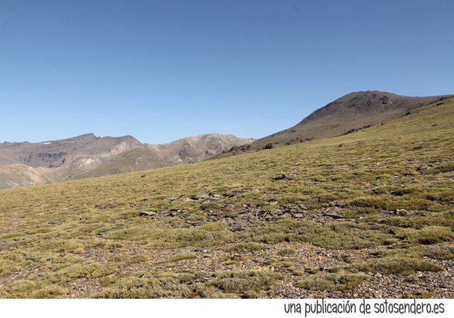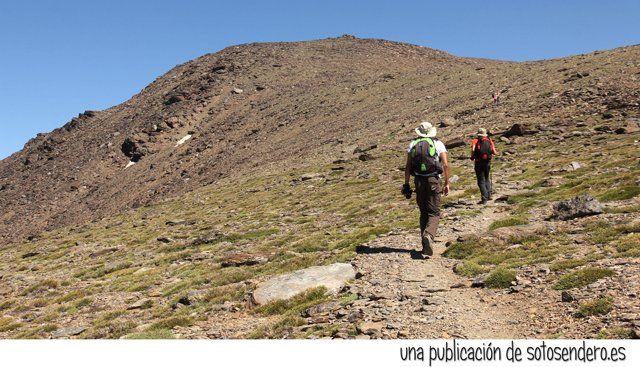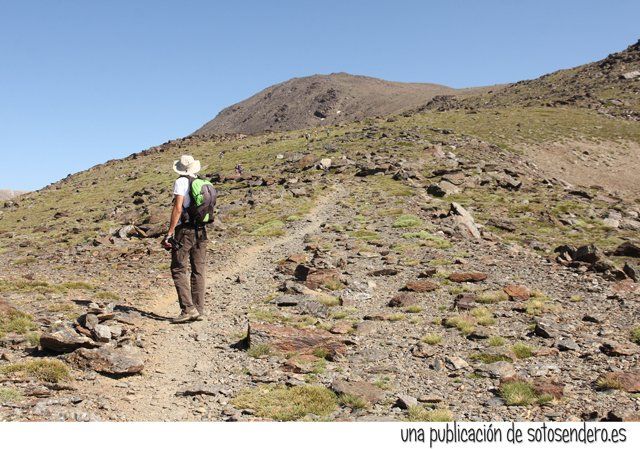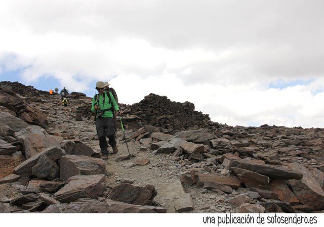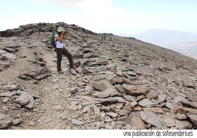 Estamos casi en lo más alto, a nuestra espalda el sol que más calienta. Tanto deslumbra, tan incómodo de mirar hacía allí que ni siquiera oteo el paisaje en aquella dirección, solo sé que hay muchas montañas. Miro al frente y ahí mismo está la loma que sube al Falso Mulhacén de 3.362m. Detrás de esa enorme mole se oculta nuestro destino: el Mulhacén, el pico más alto de la Península Ibérica. 3.479m.