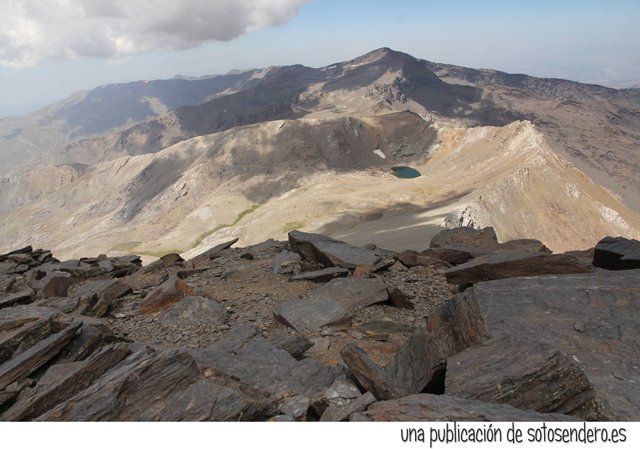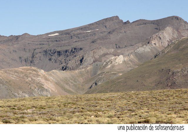 Recorro con la mirada hacia la izquierda las cumbres aserradas del inconfundible color de la piedra desnuda. Entre ellas solo atino a identificar el Veleta con su peculiar tajo vertical a la derecha.
