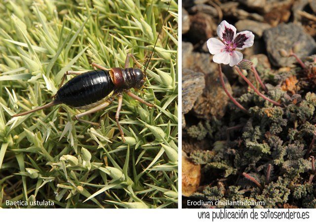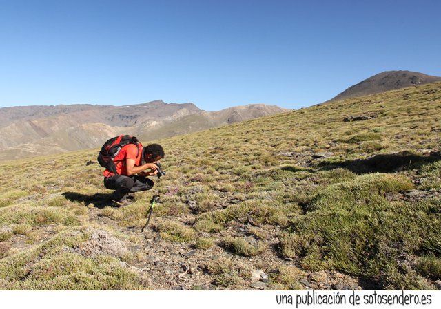 Aún no hemos llegado al falso Mulhacén cuando me he agachado a fotografiar lo que en un principio identifico como un grillo de matorral, se trata de un ortóptero endémico de Sierra Nevada. Al incorporarme me he mareado y he andado intentando guardar la compostura durante unos metros. Lo curioso del caso es que más adelante me he agachado una vez más a fotografiar no sé qué especie botánica y… me he vuelto a marear, maldita sea. Me he detenido un momento y todo ha vuelto a la normalidad. A punto he estado de abandonar mi afición a la botánica cuando he hablado con Selu de esto y me dice que a él le está pasando lo mismo.