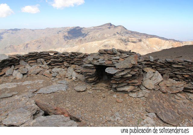 Allí mismo existen como unas corraletas de piedras apiladas. He fotografiado una de ellas con el Veleta a modo de decorado. Estas construcciones también las hay en la desnuda ladera, en medio de la nada.