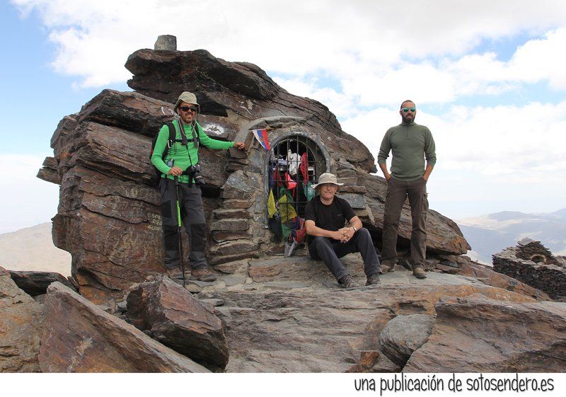 Nos hemos detenido un momento para hacernos una foto de grupo. He desplegado trípode, dispuesto figurantes y… éste es el resultado. Al fondo El Veleta.