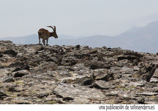 Iniciamos el descenso. En medio de aquel pedregal nos hemos topado con el dueño y señor de aquellas inhóspitas cumbres. Un impresionante macho de cabra montés que se ha pavoneado ante nosotros. Siempre ha mantenido una prudente distancia haciendo alarde de su poderosa cornamenta y otros atributos.