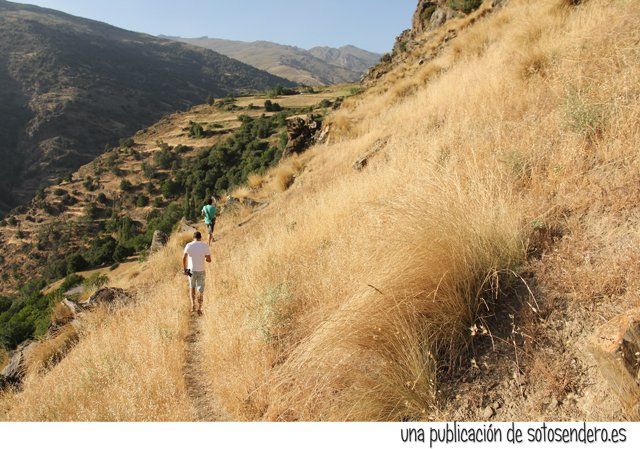 En la afueras del pueblo hemos tomado una senda que discurre por una ladera cubierta de gramíneas. La agradable luz de la tarde resalta la belleza de estos parajes. Aquí los desniveles son muy acusados y al pasar por unos cortados hemos preferido no mirar abajo. Este lugar se llama Barranco de Poqueira.