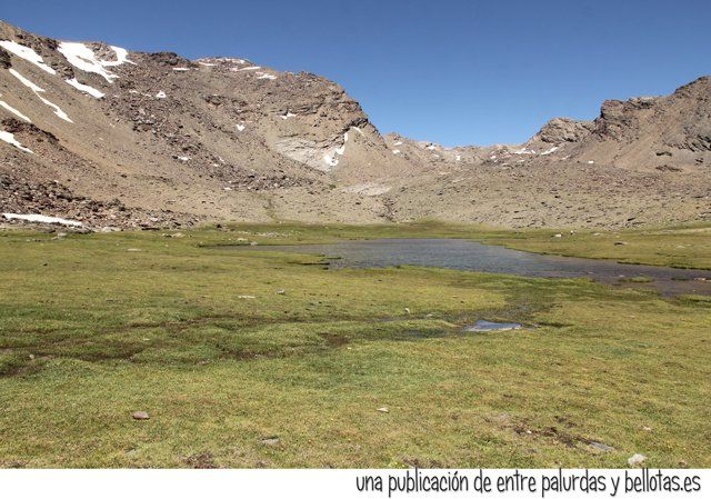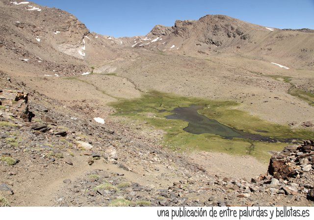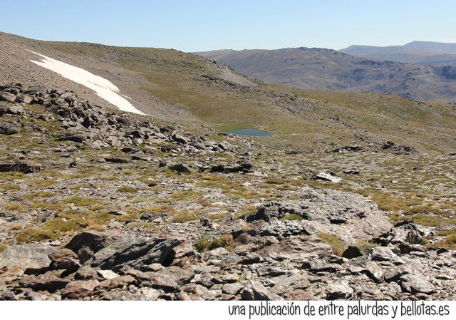 Pasamos junto a una lagunilla situada encima de Los Tajos de Peñón Negro. A la diestra la laguna y a la siniestra un enorme nevero que se desparramaba por la pedregosa ladera.