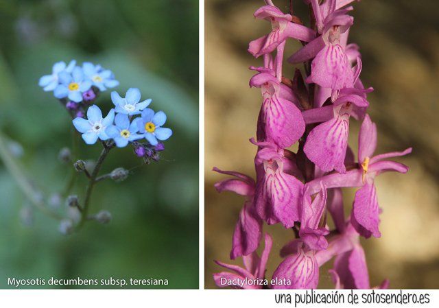 El sendero subía bajo la protección de esbeltos chopos, allí moraban plantas que gustaban de suelos frescos y húmedos. Nomeolvides de pétalos celestes y alguna que otra orquídea.