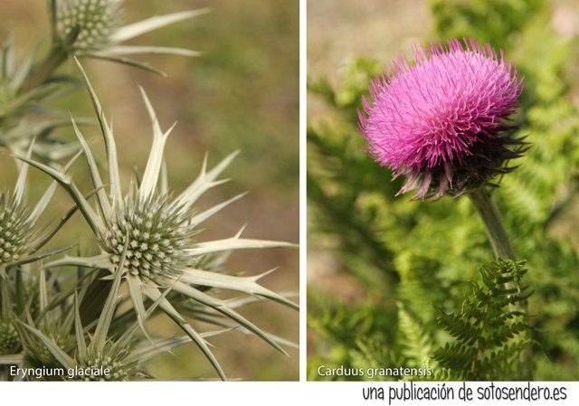 de delicados pétalos rosas, un agracejo en flor, una compuesta de flor amarilla y un antipático Eryngium