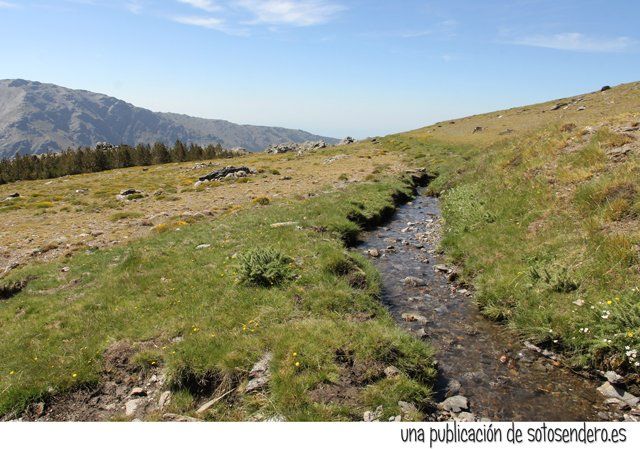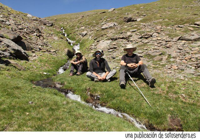 De vez en cuando en algunas cañadas el agua se abría paso creando auténticas torrenteras. Me llamó la atención el contraste del verdor de sus orillas cubiertas de fresca hierba con el pedregal por donde discurría. Y en uno de esos idílicos lugares nos hicimos una foto sentados sobre la hierba.