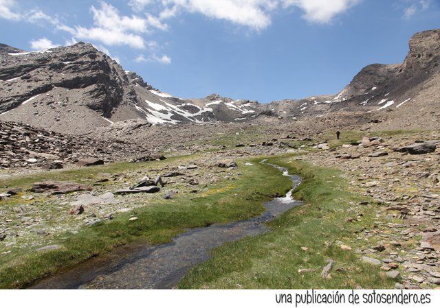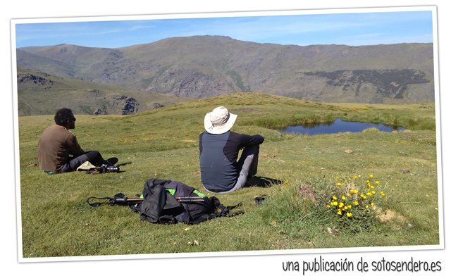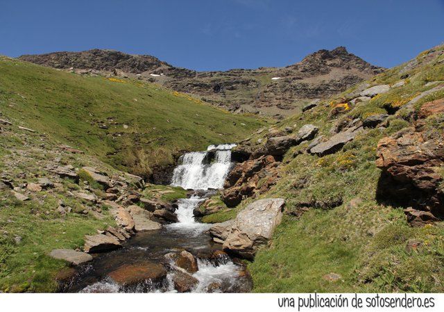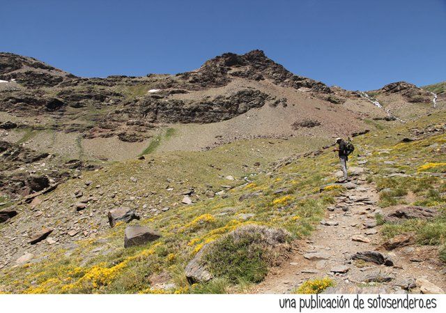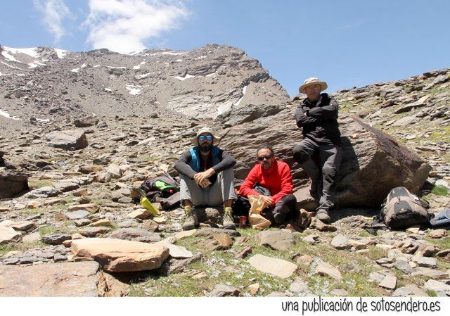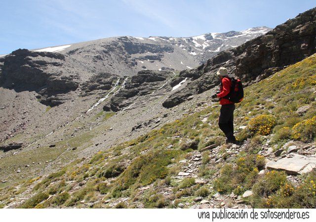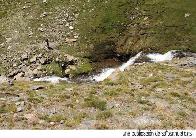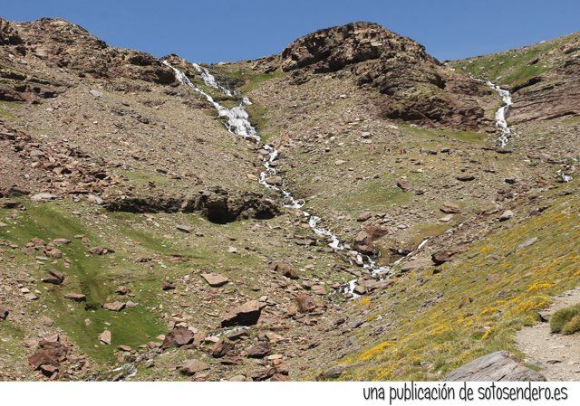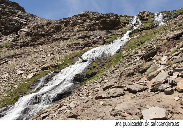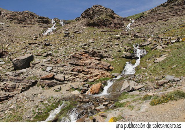 El sendero nos llevó ante aquel lugar del que nos habló el locuaz arriero. Y en ese preciso instante recordamos sus palabras: “Subid por las Chorreras Negras, pegados a la de la izquierda, cuando lleguéis arriba las vistas son impresionantes. A un lado el Mulhacén, y al otro lado del cordel… el Peñón del Globo, el Puntal de Siete Lagunas y detrás… el Alcazaba. Nosotros subimos por la loma porque por ahí no pueden pasar las bestias.” Y cuando nos contó todo aquello, procuramos no olvidar ninguno de los topónimos.