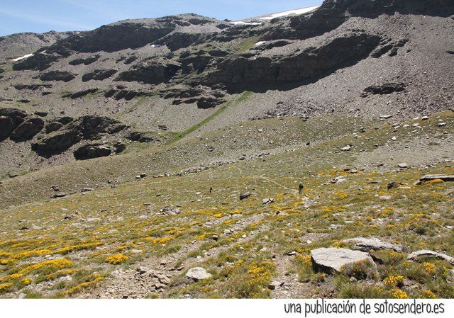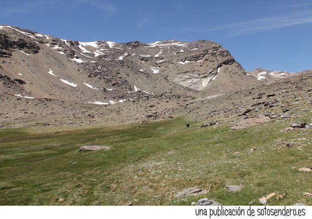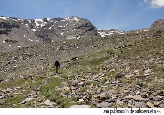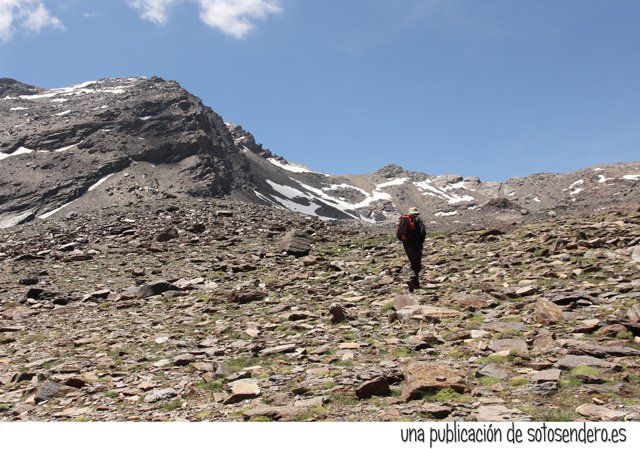 Tras la ingesta, aunque disponíamos de poco tiempo, optamos por seguir adelante para explorar aquellos parajes. Caminamos por una pedregosa loma hacia un collado que cerraba aquel circo por el norte. A un lado el Mulhacén y al otro el Peñón del Globo.
