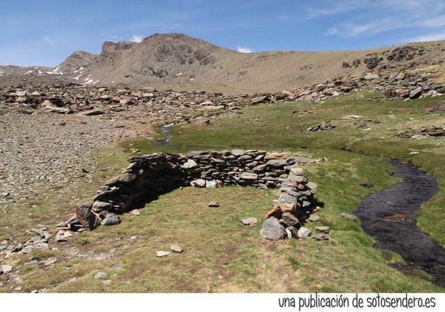 Habíamos alcanzado los 2.400 m. de altura cuando llegamos a un paraje que las gentes de estas tierras conocían como las Campiñuelas. Un cortijo de recios muros y planta rectangular junto a una era circular de enorme lozas de piedra casi negra y numerosos bancales en la ladera revelaban el uso agrícola y ganadero en este lugar.